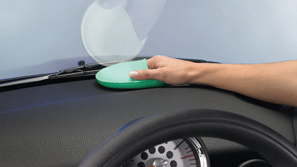 Schritt 2 — Auffrischung (10–20 Minuten): Für Innen-Kunststoffe den KunststoffDetailer auf ein Mikrofaser-Pad sprühen und dünn auftragen. Panel für Panel arbeiten: Armaturenbrett, dann Mittelkonsole, dann Türverkleidungen. So behältst du den Überblick und vermeidest, Stellen zu vergessen. Für vergraute Außen-Kunststoffe das KunststoffGel mit einem weichen Applikator in die Oberfläche einarbeiten. Kurz einwirken lassen, dann mit einem sauberen Mikrofasertuch nachwischen. Das Ergebnis ist sofort sichtbar — die Farbe kommt zurück, matte Stellen verschwinden, und der Kunststoff fühlt sich wieder glatt und gepflegt an.