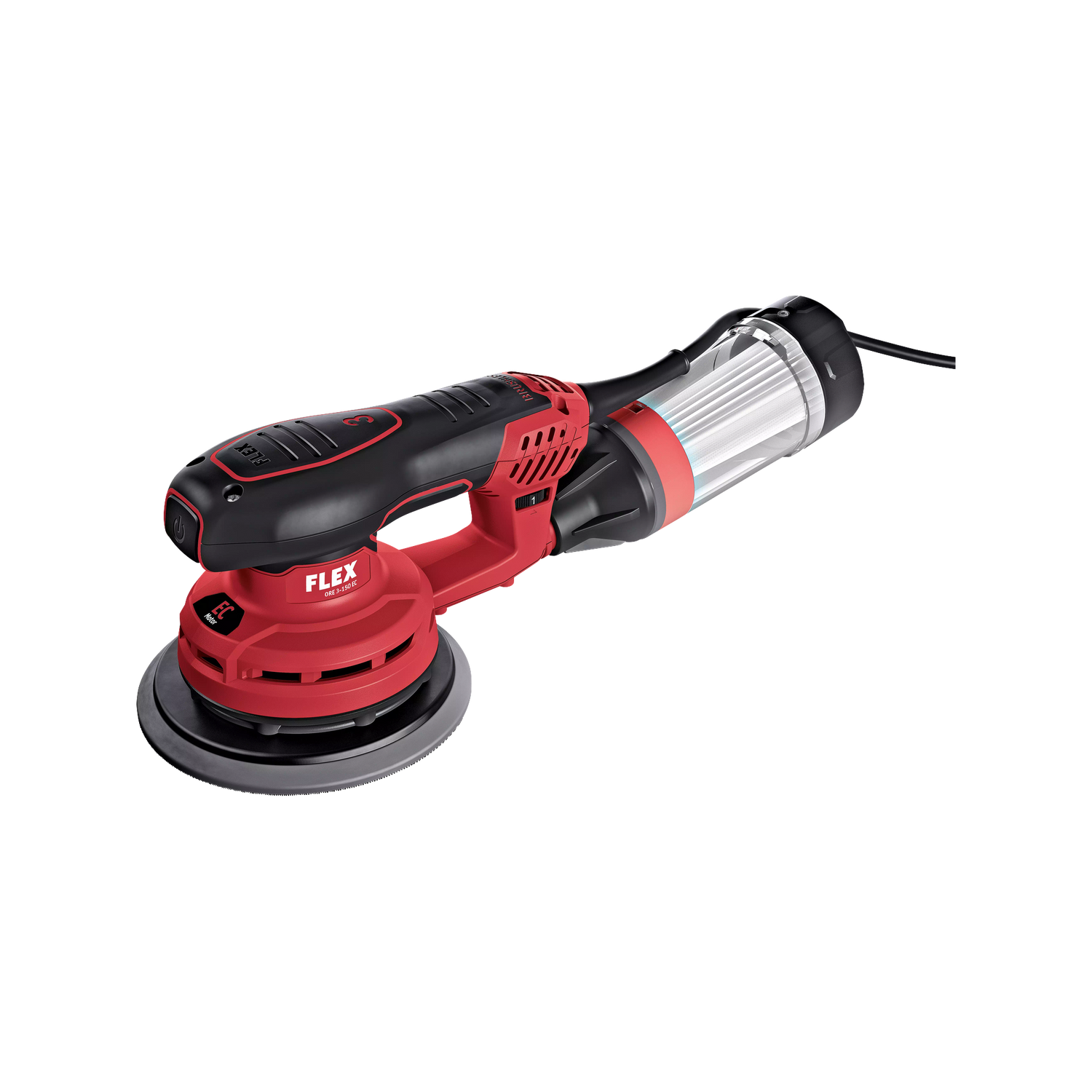 The integrated dust extraction system of the FLEX ORE 3-150 EC 230/CEE with PES microfilter cartridge keeps the work area clean with moderate dust levels. The microfilter cartridge included in the scope of delivery (486833) is specially designed for fine sanding dusts and collects particles before they land on the surface and distort the sanding pattern with scratches. For occasional use and outdoor sanding where no hose can be laid, the integrated dust extraction is the practical standby solution.