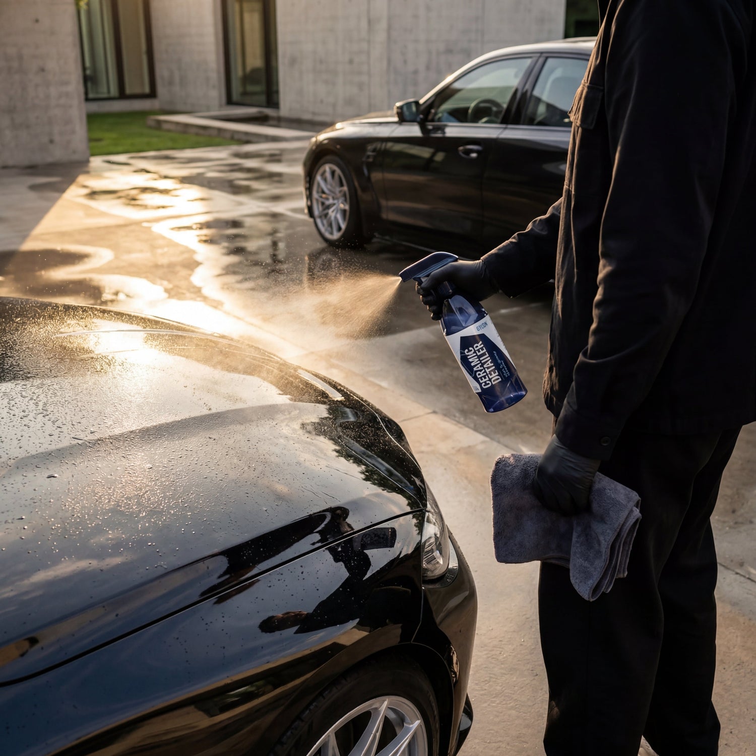 One spray per body panel is enough — whether on wet or dry paint. Distribute the product with a short-pile microfiber towel (300–400 GSM) in straight, overlapping passes. Do not work in circular motions, as this can create holograms on sensitive paintwork.