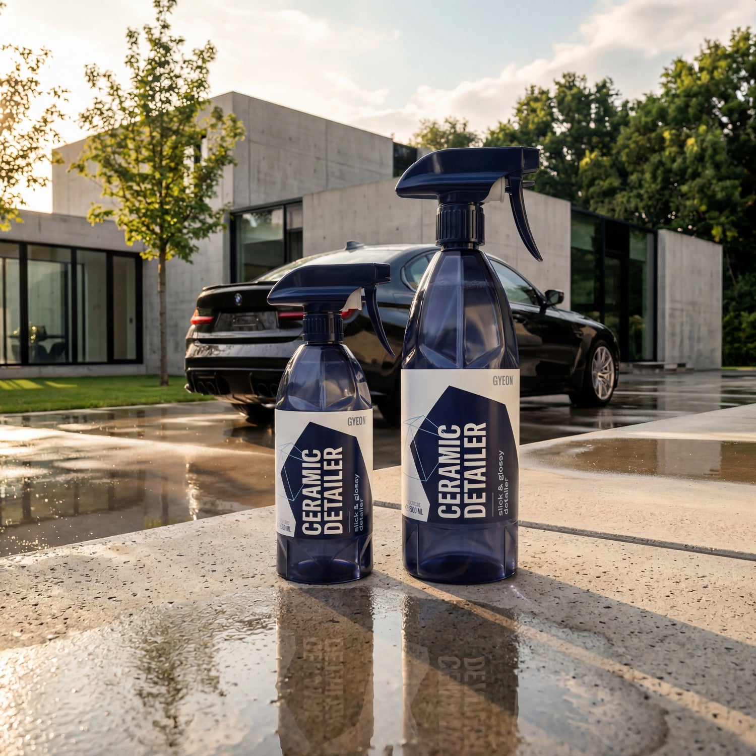 CeramicDetailer is a quick detailer for a fast refresh in between — 2 minutes effort, 4–6 weeks durability. Q²M Cure is a full-fledged spray sealant with a higher SiO₂ concentration — 15 minutes effort, 3–6 months durability. Ideal: Cure every 2–3 months as a base, CeramicDetailer weekly in between.