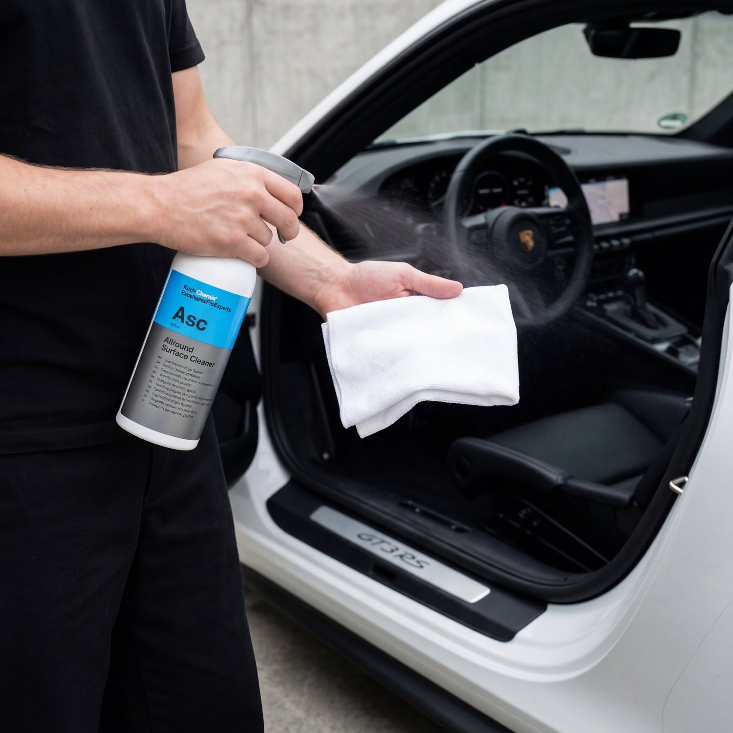Koch-Chemie ASC (Allround Surface Cleaner) is a pH-neutral universal cleaner for almost all surfaces in a vehicle's interior. It removes fingerprints, skin oils, nicotine films, and light dirt from plastic, leather, Alcantara, fabric, and piano lacquer. Thanks to its mild formula, it does not attack plasticizers or dyes and leaves no shiny residue — the standard cleaner for daily detailing.