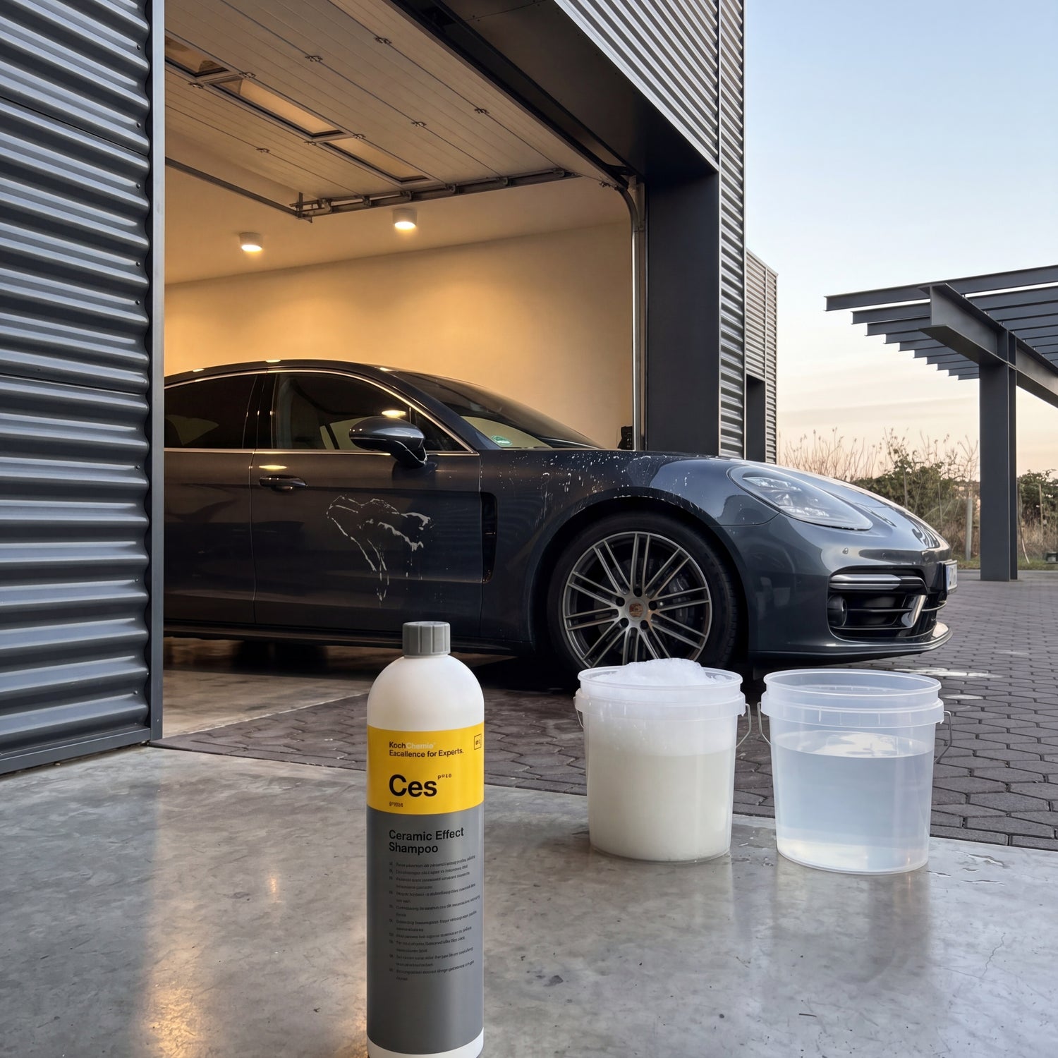 Dilute 50 ml of Ces in 10 liters of warm water in the wash bucket (1:200) and lather briefly. Work using the two-bucket method with a second rinse bucket and a microfiber wash mitt. Always pre-rinse thoroughly, never apply to warm paintwork or in direct sunlight. Rinse section by section – the polymer film only forms during rinsing, not during foaming.