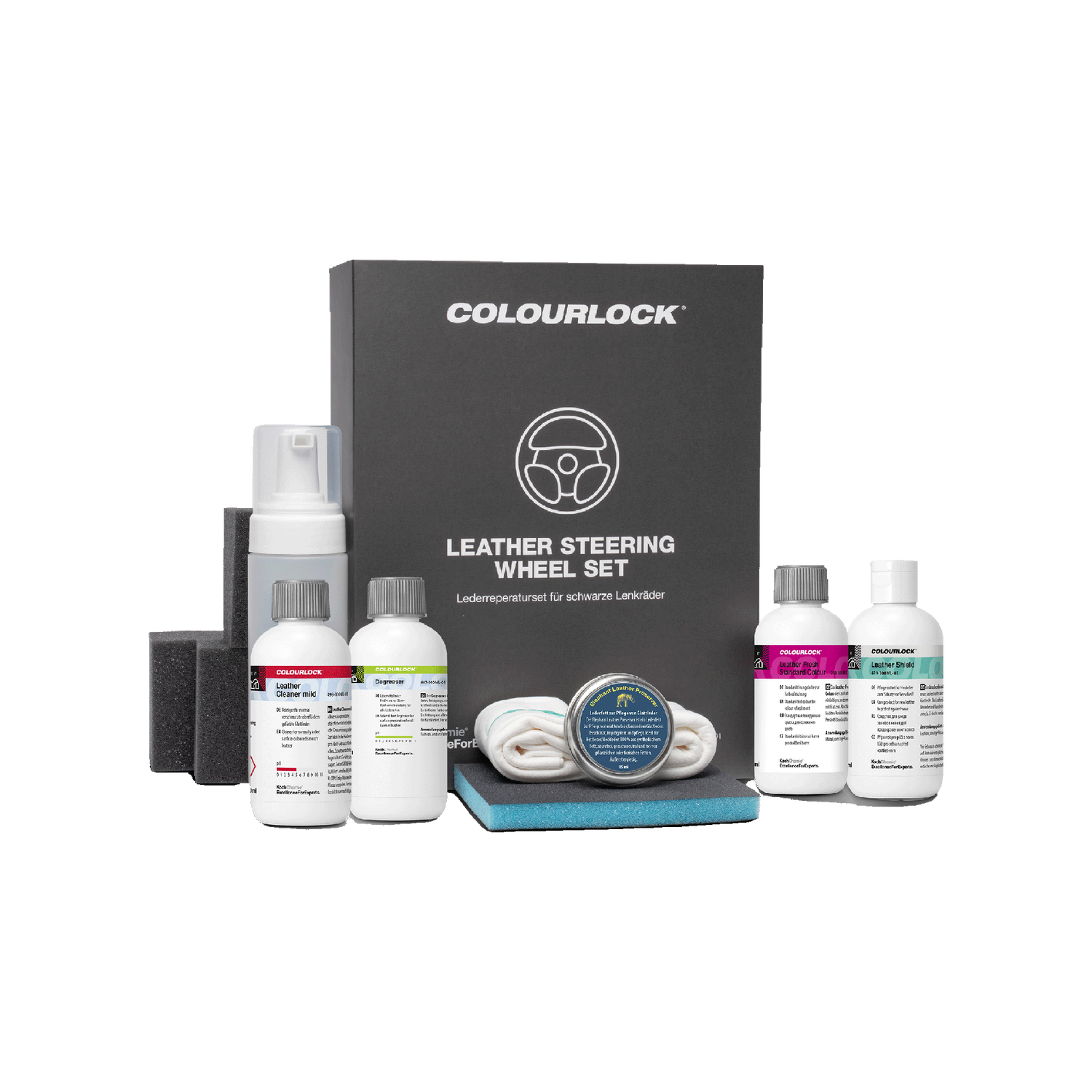 How do you permanently repair a worn leather steering wheel? The COLOURLOCK "Leather Steering Wheel" Set cleans, degreases, dyes, and protects your steering wheel in a coordinated system – for an original finish, better feel, and significantly reduced daily wear.