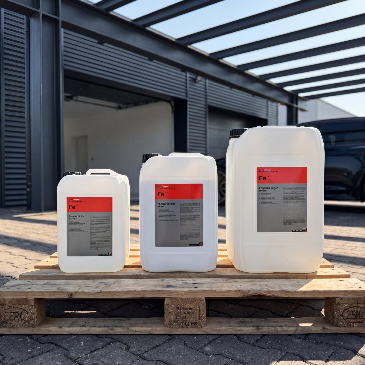 The Fe is not an end-customer product. It belongs in the workshop, in the detailing bay, and in the car wash tunnel. If someone uses it privately in their home garage, they are buying 11 kg of concentrate for a task that an acid-free cleaner in a 1-liter format can solve just as well — with significantly less risk to the rim and their own health.
