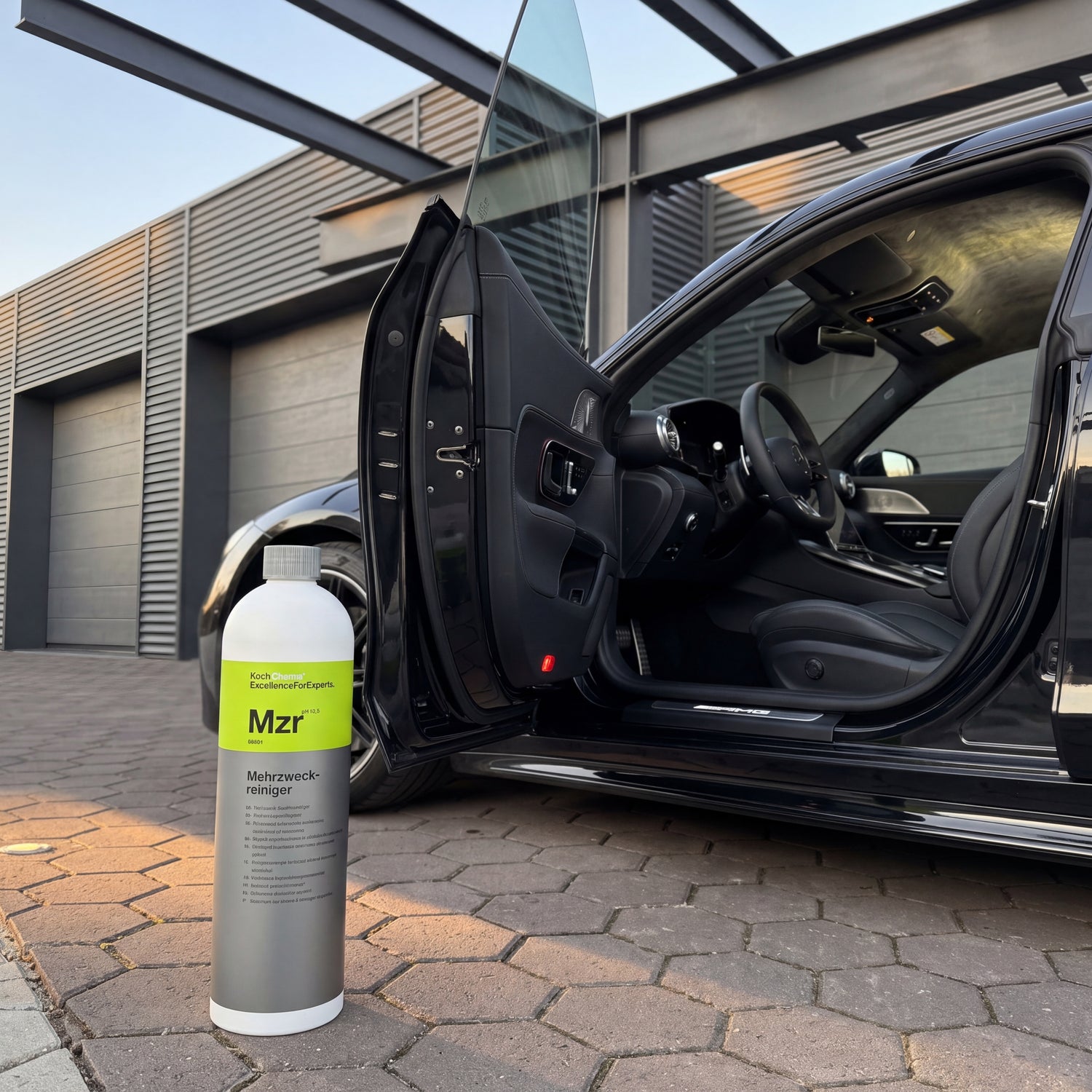 Where Mzr is not the right product: On genuine leather and artificial leather with an open-pore structure, the alkalinity can dry out the surface and leave discoloration. Leather requires a pH-adjusted leather cleaner. On soft-touch plastics and rubberized surfaces such as steering wheels or gear knobs, it leaves dull spots. An alkaline cleaner has no place on painted or foiled surfaces – even diluted to 1:50, the pH value is above 9. If you need a universal cleaner without risk for sensitive materials, Koch-Chemie ASC is the safer choice – pre-mixed, pH-neutral, for all surfaces.
