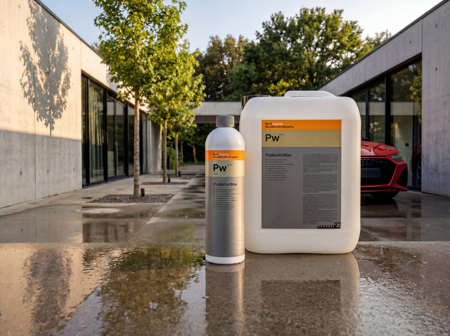 Koch-Chemie Protector Wax (Pw) is a preserving wax concentrate applied as a wet sealant after vehicle washing. It creates a lotus effect with high gloss on paintwork, plastic, rubber, and convertible tops. The product originates from the car wash sector and is used as a spray solution (30 ml per 1 liter of water) manually or mechanically.