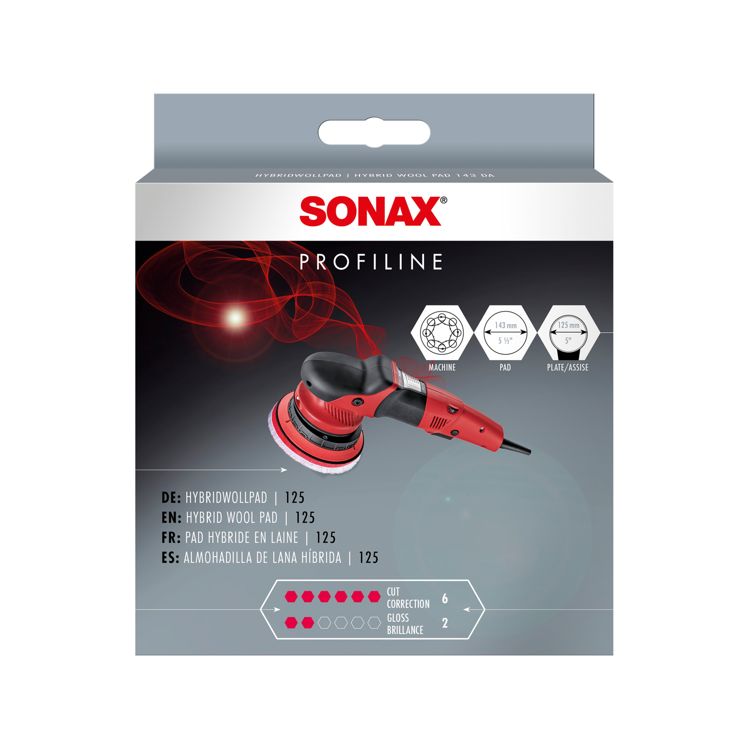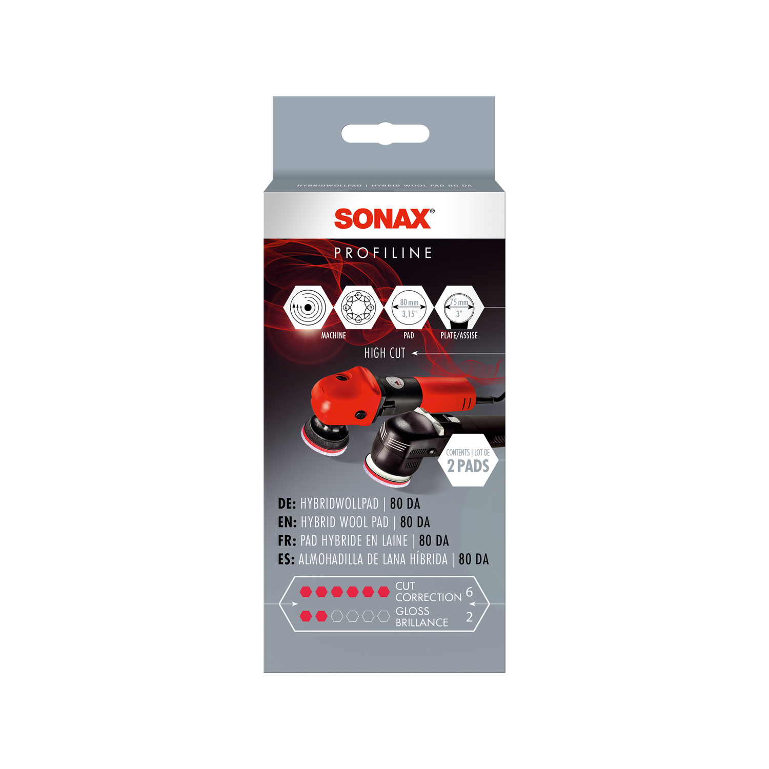 The HybridWoolPad is designed for use with heavy-cut polishes. The recommended combination in the PROFILINE system is the HybridWoolPad with SONAX PROFILINE CutMax "6/4" abrasive polish or PROFILINE UltimateCut "6+/3" — the strongest polishes in the range. These combinations are designed for vehicles with severe P800-P1000 sanding marks, deep oxidation, or heavy holograms from machine pre-treatments.