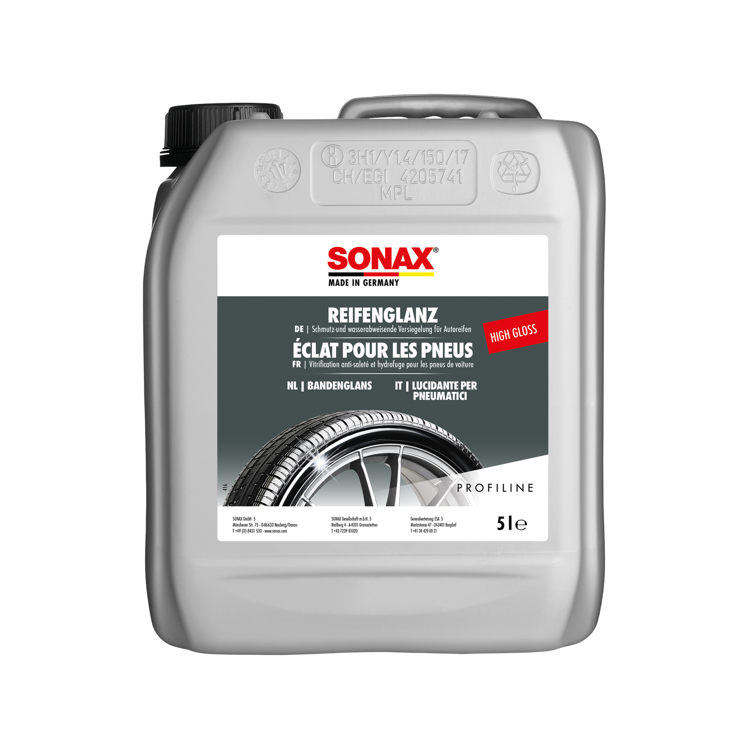 SONAX PROFILINE Tire Gloss "Wet Look" in a 5-liter container is the right choice for any detailing business that has integrated tire care as a fixed step in their detailing protocol. The bulk container covers material costs for many vehicle detailing jobs and enables a consistently high standard in tire care without requiring regular small orders.