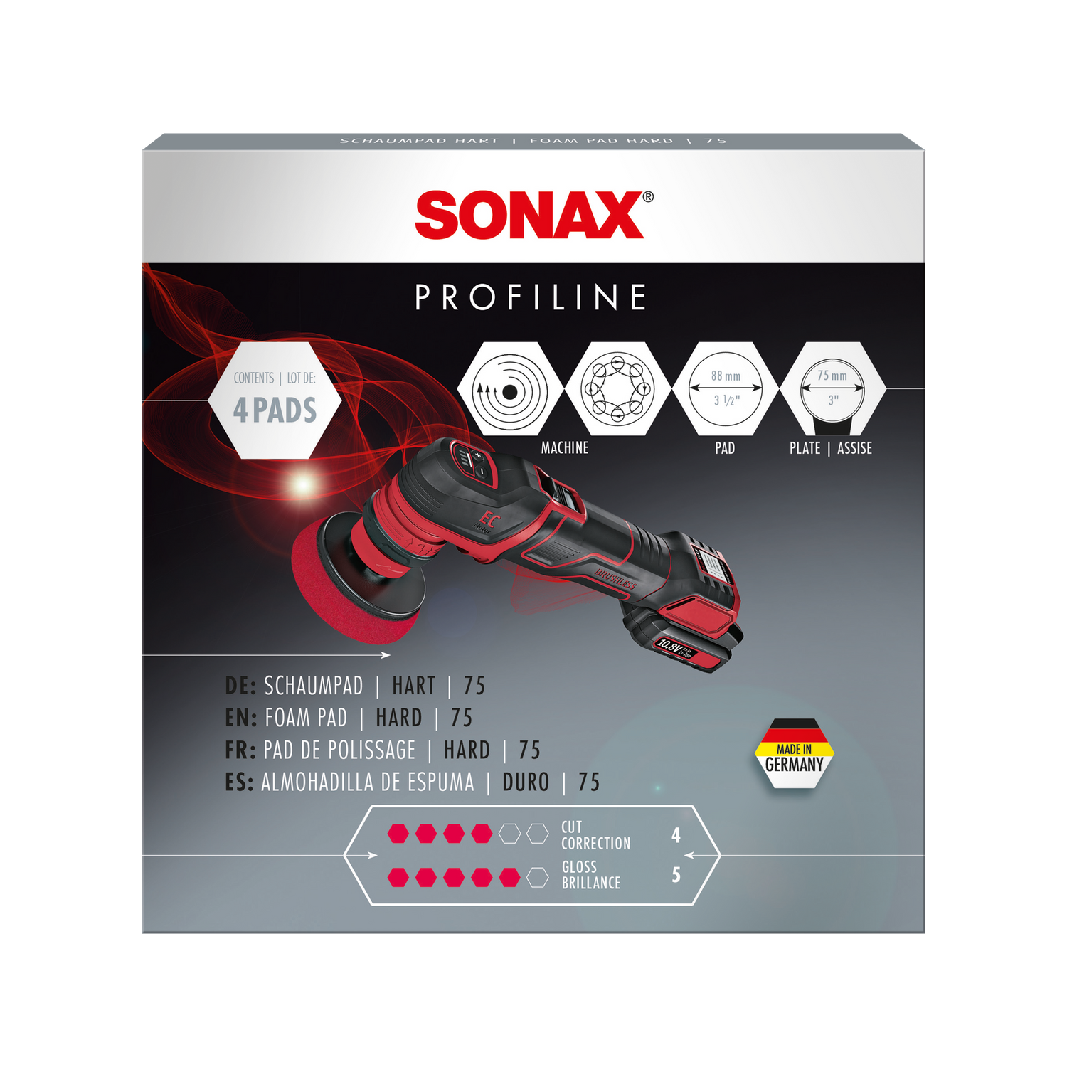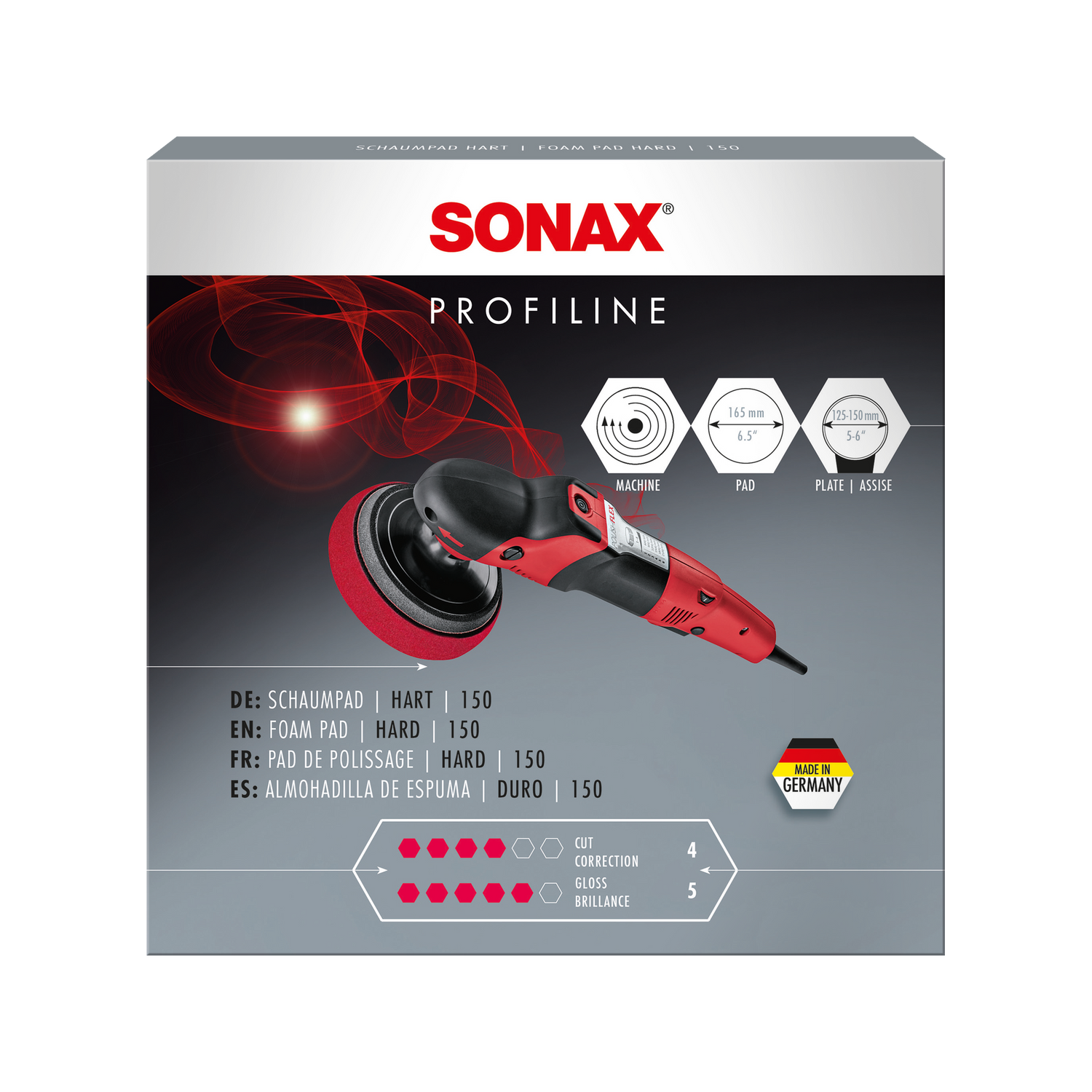 The cutting power of a polishing pad system results from the interaction of three factors: the hardness of the pad, the open-pore structure of the foam, and the abrasive power of the polish used. The FoamPad hard is designed for maximum pad intensity — it is the hardest foam pad in the PROFILINE range and thus the right pad for heavy-cut polishes such as the SONAX PROFILINE CutMax "6/4" Abrasive Polish or the SONAX PROFILINE UltimateCut "6+/3".