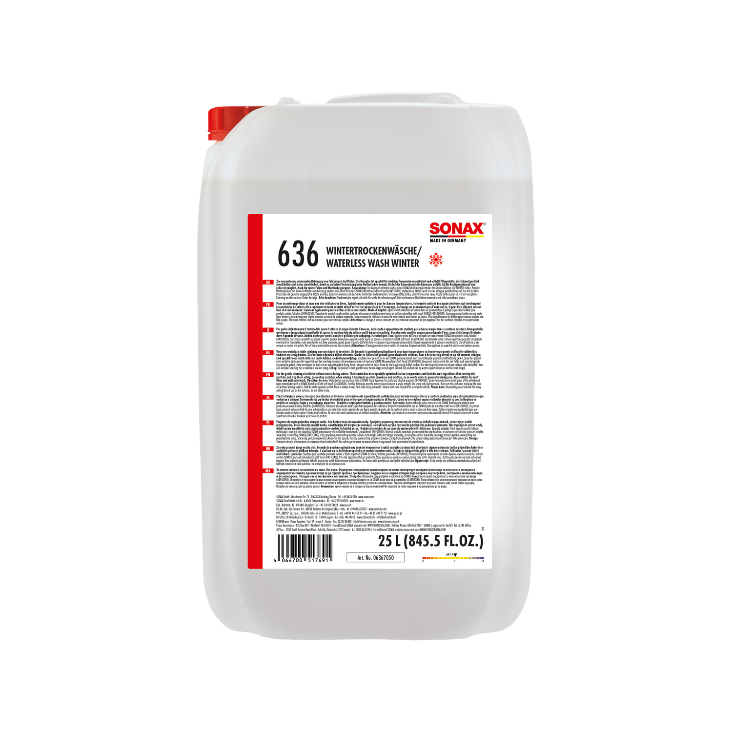 • 25-liter container for professional fleet and workshop use. The 25-liter bottle is designed for commercial volume consumption. Fleet operators with regular cleaning needs, car rental companies, and used car dealers who need to prepare vehicles even in the cold season benefit from a volume container that does not require frequent reordering and reduces product costs per vehicle cleaning.