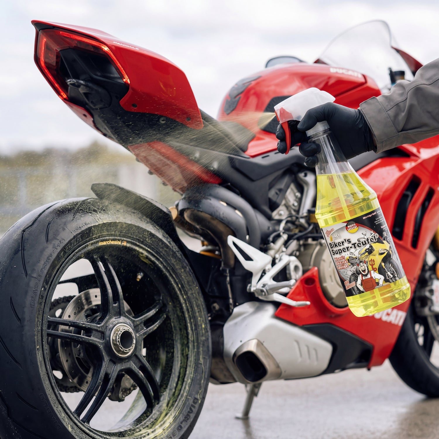 Biker's Super-Teufel being sprayed with nitrile glove on front fork and fender of a naked motorcycle