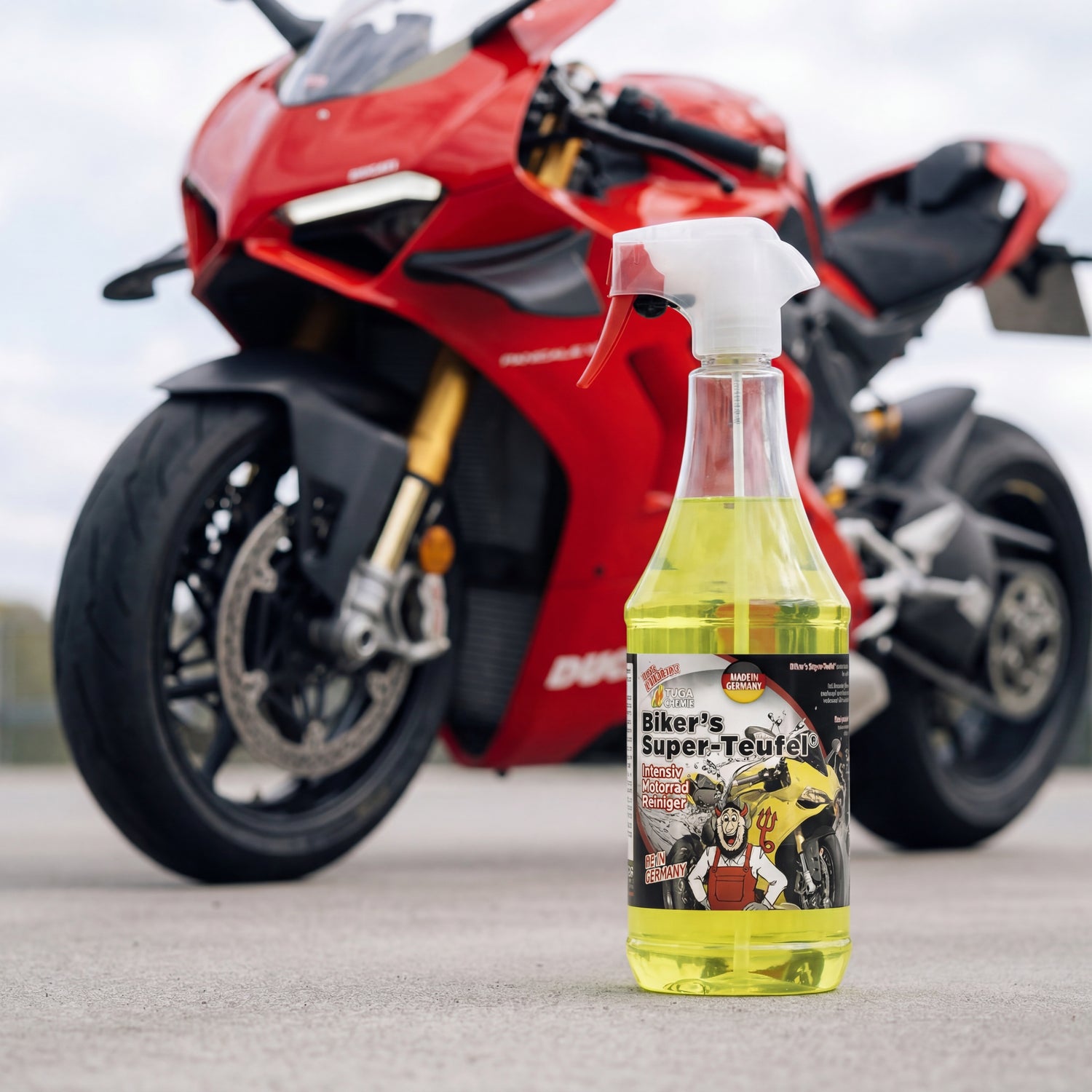 TUGA Chemie Biker's Super-Teufel 1L spray bottle with yellow liquid and red trigger on concrete forecourt in front of modern naked motorcycle