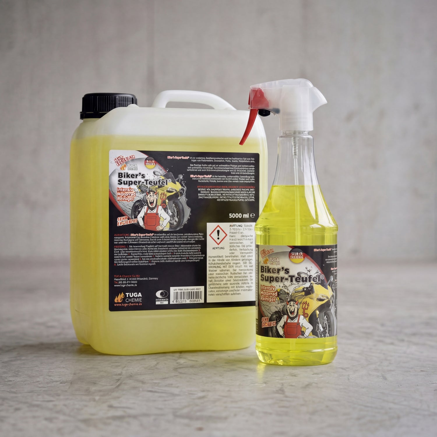 TUGA Chemie Biker's Super-Teufel 5 liter canister and 1 liter spray bottle side by side on concrete forecourt