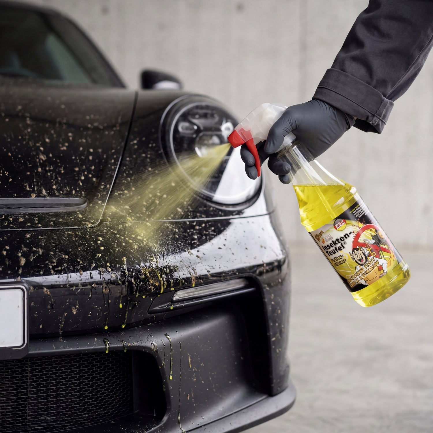 Practical Tip from Detailing1: Never spray the Insect-Devil on hot paint directly after driving — the active ingredient dries too quickly and leaves dull streaks. Let the vehicle cool down in the shade for 15 minutes, then pre-wet the front end with a coarse stream of water. Only then spray the gel evenly. The light layer of water prevents drying and extends the exposure time to the full 3–5 minutes during which the alkaline reaction takes place.