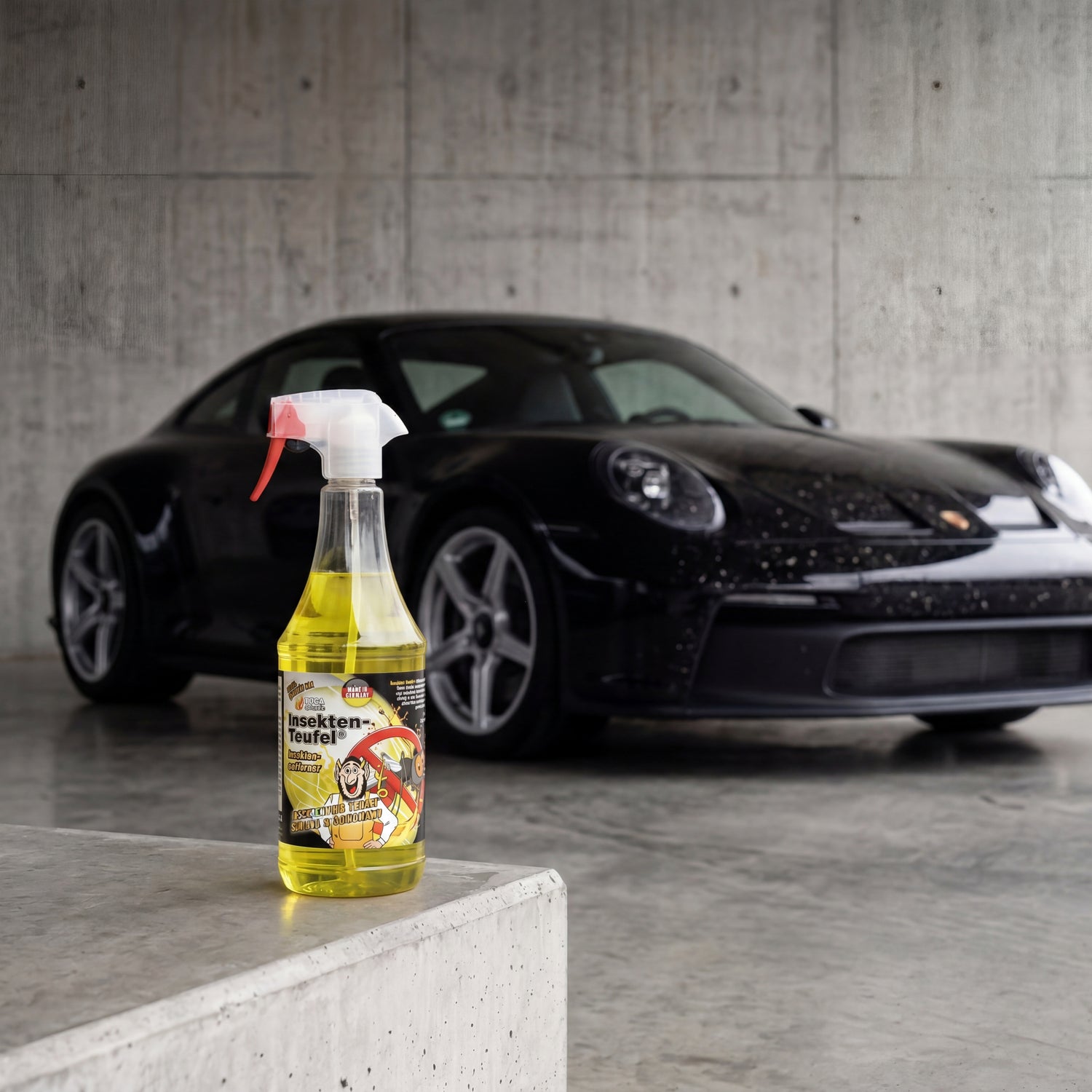 What is Insect-Devil? An alkaline insect remover from TUGA Chemie that chemically breaks down dried insect residues, pollen, and tree blossom dust on paint, glass, and plastic — without mechanical rubbing. Not suitable for resinous tree sap drops, tar spots, or oily road grime.