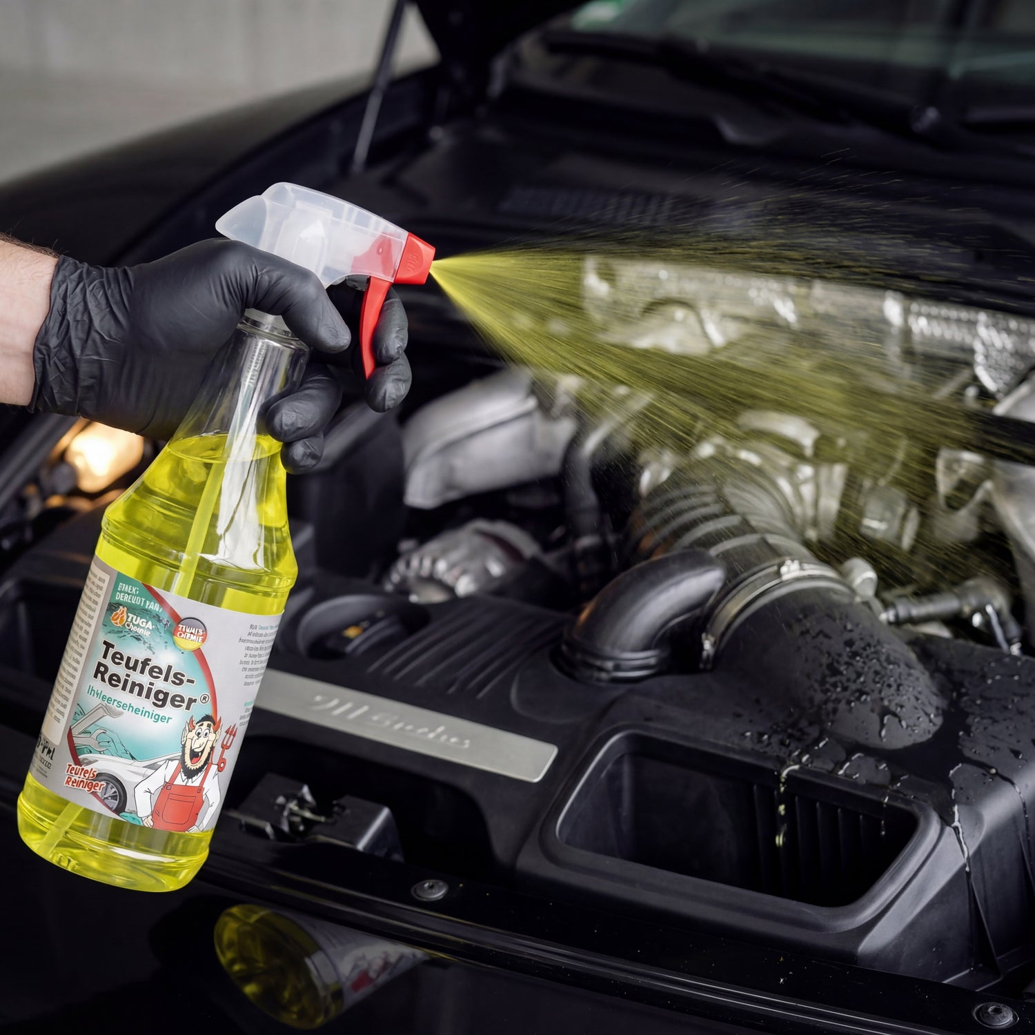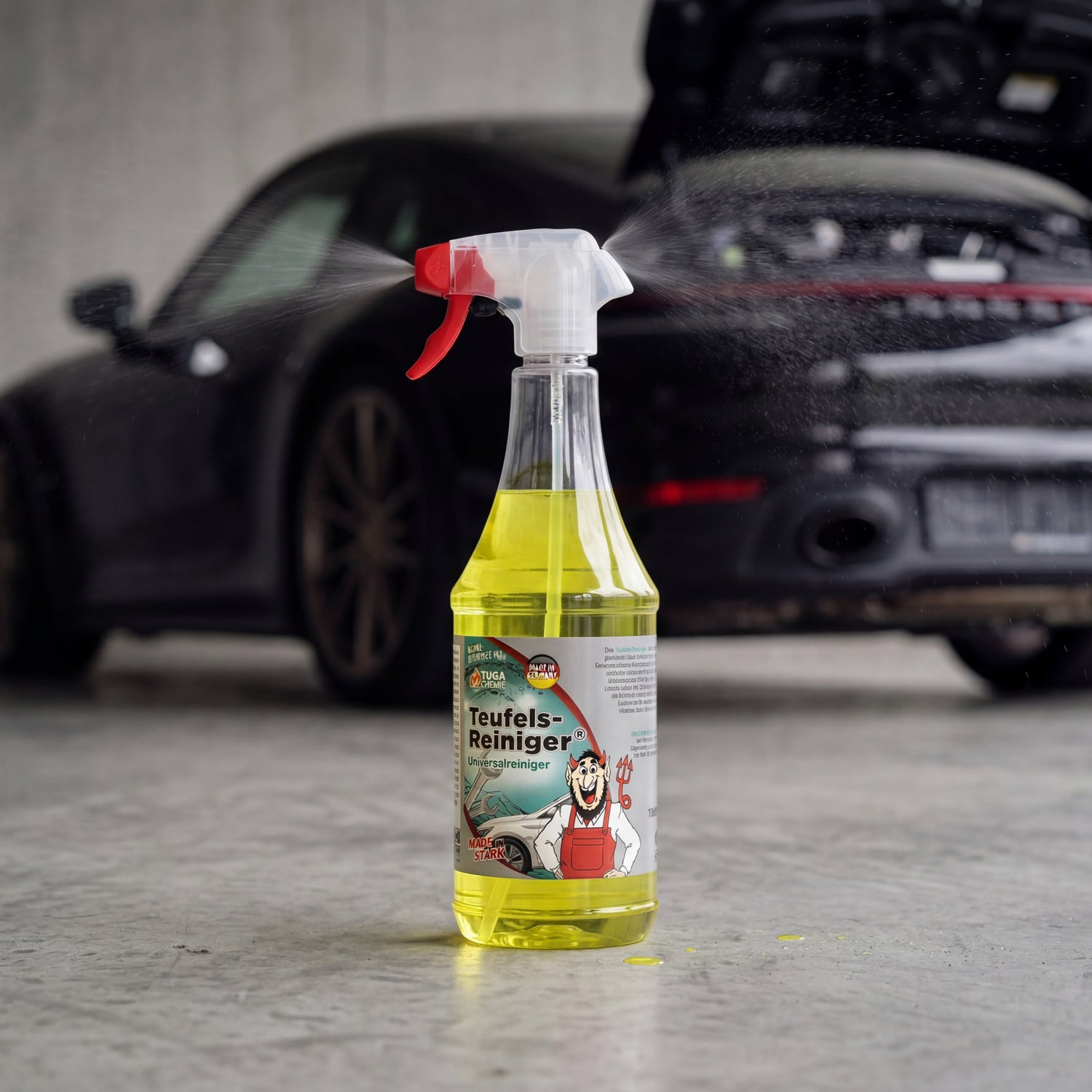 What is Teufels-Reiniger? An alkaline all-purpose cleaner from TUGA Chemie that is diluted 1:50 to 1:5 depending on the degree of soiling. For engine bays, soiled bumpers, floor mats, door sills, sealed plastic surfaces, and as a snow foam pre-wash. Not suitable for Alcantara, open-pore leather, unprotected displays, polished aluminum without subsequent rinsing, and long dwell times on clear coat under direct sunlight.