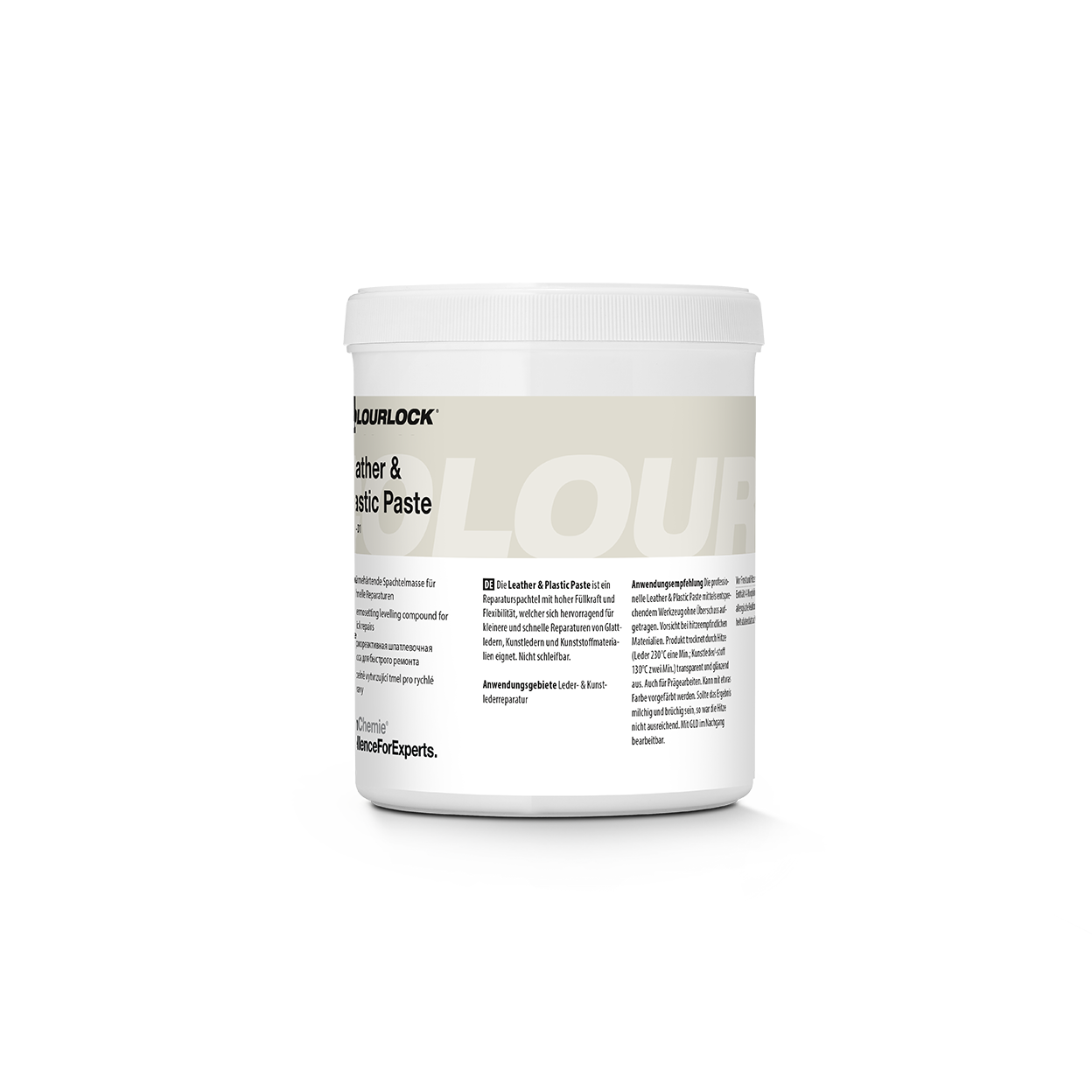 COLOURLOCK Leather & Plastic Paste ist eine professionelle, wärmehärtende Spachtelmasse zur Reparatur von stark beschädigten Leder- und Kunststoffoberflächen. Sie eignet sich ideal für tiefe Risse, Löcher, Brüche, Kantenabbrüche und Materialverluste, bei denen herkömmliche Filler nicht mehr ausreichen. Durch die gezielte Aushärtung mit Wärme entsteht eine besonders feste, formstabile Reparaturbasis, die anschließend geschliffen, strukturiert, gefärbt und versiegelt werden kann.