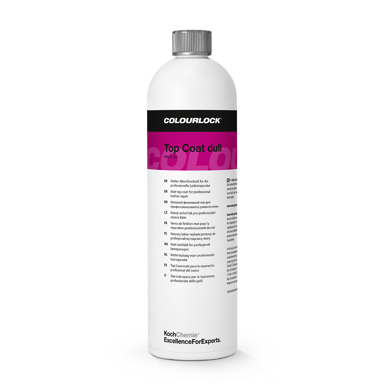 COLOURLOCK Top Coat (Dull) ist ein matter Abschlusslack zur professionellen Versiegelung von Lederoberflächen nach Reparatur- oder Färbearbeiten. Er schützt die Farbschicht zuverlässig vor Abrieb, Reibung, Hautfetten und alltäglicher Beanspruchung und stellt gleichzeitig eine gleichmäßige, natürliche Mattoptik her. Besonders bei modernen Automotive-Ledern, Möbeln und Interieurteilen ist ein matter Look entscheidend, um das originale Erscheinungsbild zu erhalten.