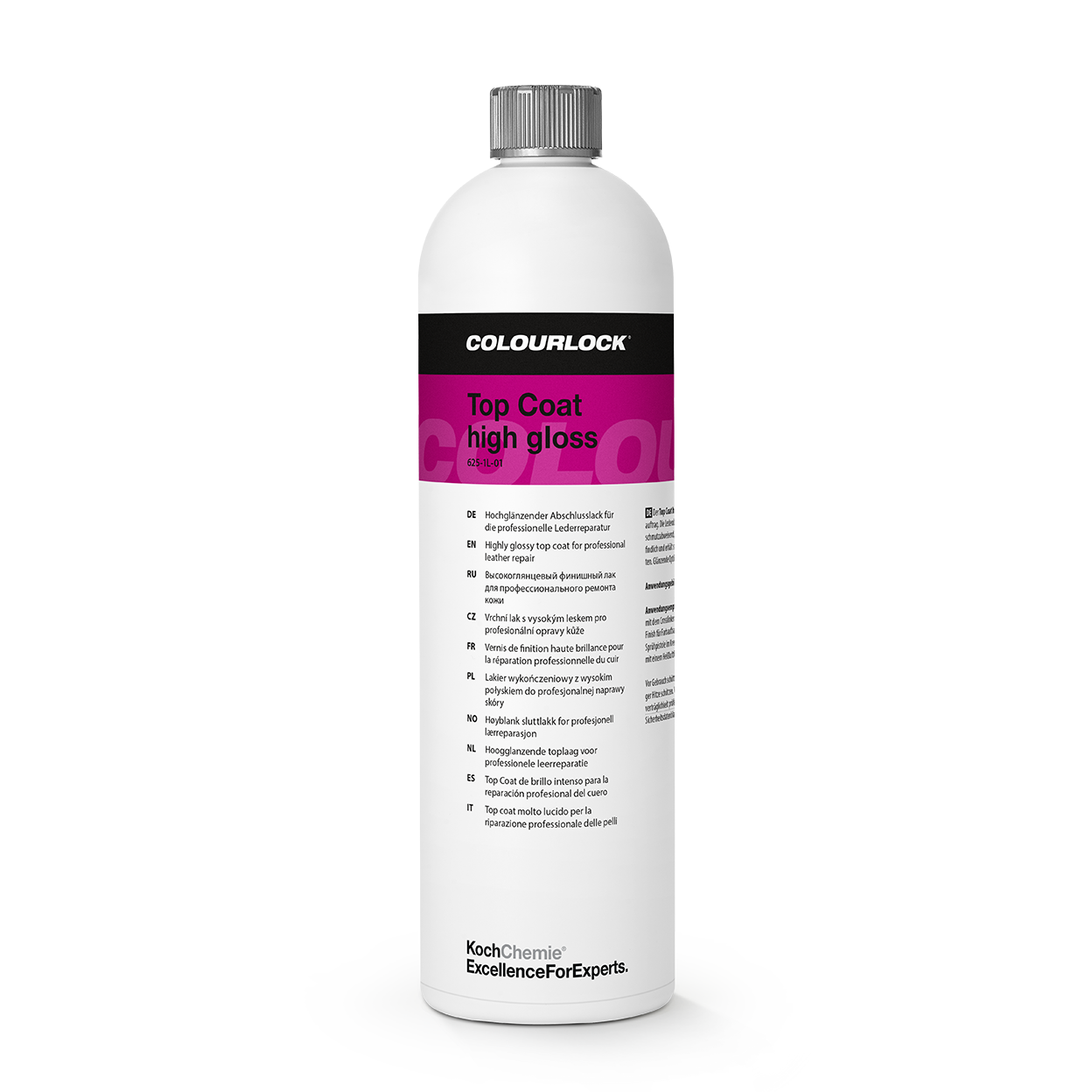 COLOURLOCK Top Coat (High Gloss) ist der intensiv glänzende Premium-Abschlusslack für farblich repariertes oder aufgefrischtes Leder. Er bildet einen hochtransparenten, spiegelglänzenden Schutzfilm, der die Farbschicht zuverlässig vor Abrieb, Schweiß, Reibung und täglicher Beanspruchung schützt. Die stark reflektierende Oberfläche sorgt für maximale Brillanz, tiefe Farbwirkung und ein besonders edles, poliertes Finish – ideal für dekorative Möbel, Designerstücke, Taschen, Accessoires oder glänzende Interieurflächen. Der Lack wird dünn aufgetragen und verläuft glatt, sodass ein klarer Spiegelglanz entsteht. In Kombination mit Crosslinker CD lässt sich die Haltbarkeit weiter erhöhen, während Soft Slip optional die Haptik verfeinert. High Gloss ist die richtige Wahl, wenn ein auffälliges, luxuriös glänzendes Endergebnis gefragt ist, das jede Reparatur sichtbar veredelt.
